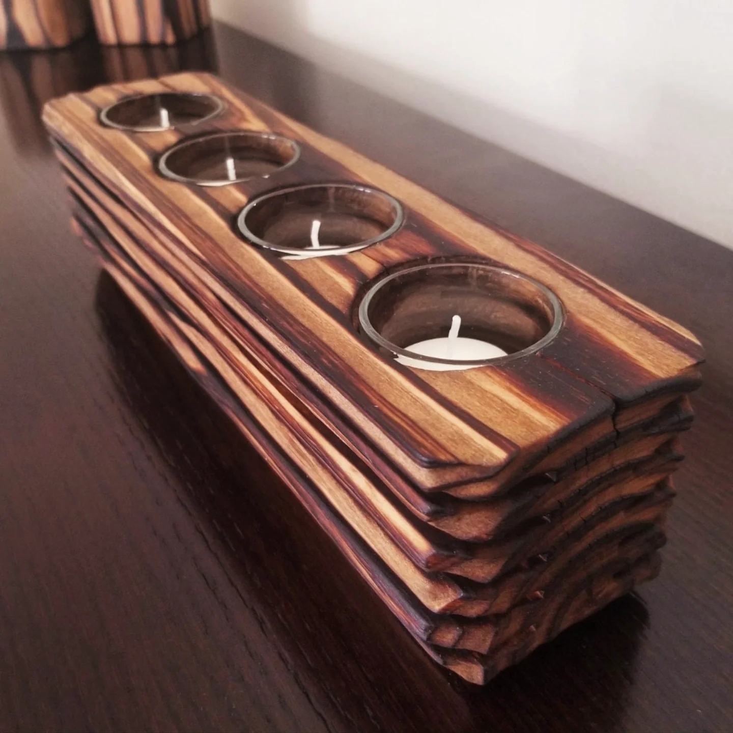 Bring warmth, texture, and handcrafted beauty to your home with this set of 3 wood tealight candle holders, made from white pine and finished using the traditional Japanese Shou Sugi Ban technique. Each piece is individually torched and stained by hand, revealing a stunning contrast between the charred grain and rich wood tones.