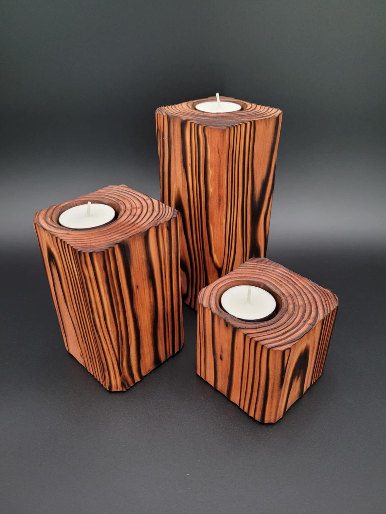 3 handcrafted wood tealight candle holders (heights: 3", 5", and 7")